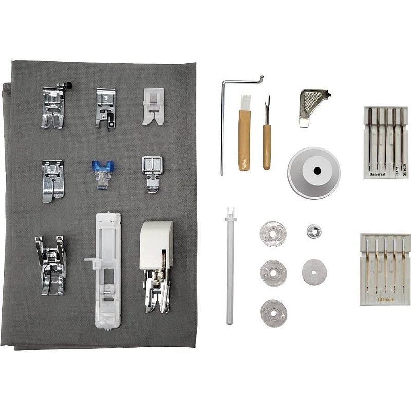Příslušenství zahrnuje Power Stitch kluznou přítlačnou patku pro šití těžkých materiálů