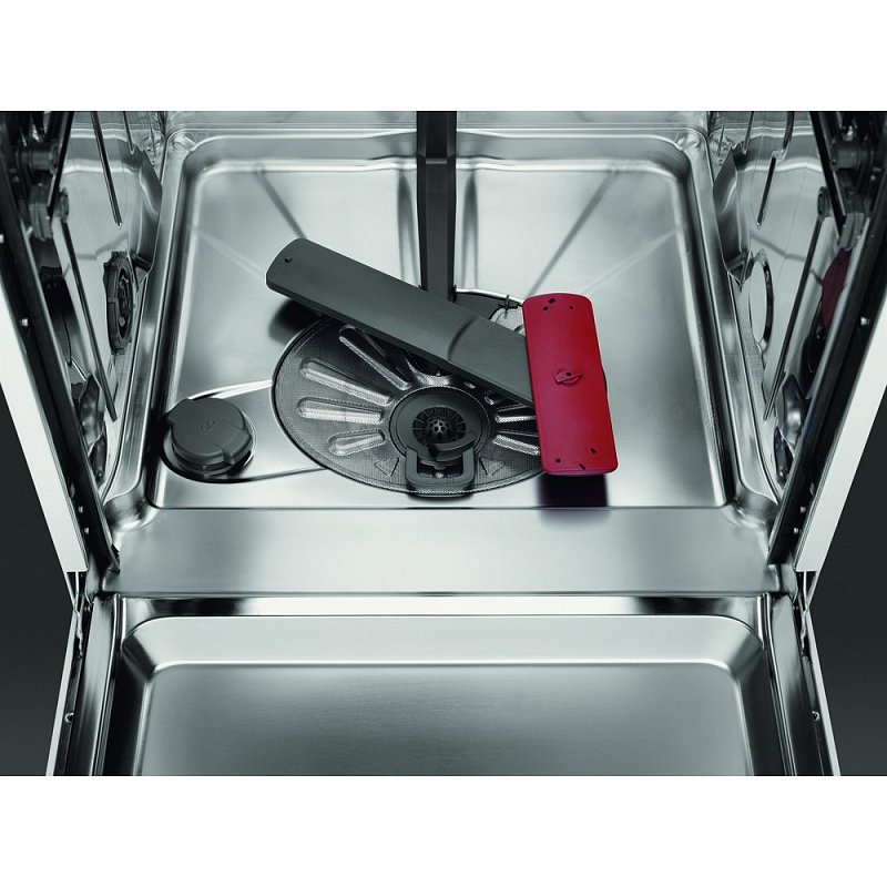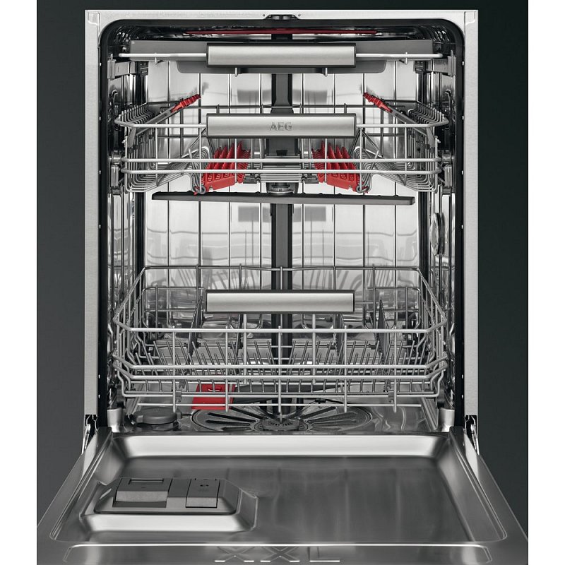 Vlastnosti horního koše: šetrné úchyty na 12 sklenic na víno, 2 skládací držáky, 2 skládací drátěné držáky pro skleničky, 2 měkké špičky, skládací poličky na šálky, nerezové držadlo AEG