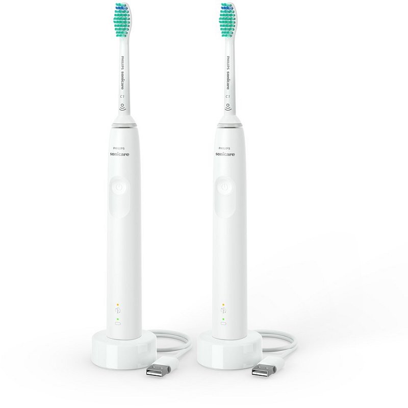 Balení obsahuje: 2 sonické kartáčky Philips Sonicare 3100, 2 hlavice ProResults Standard, 2 USB nabíjecí kabely se stojánkem (napájecí adaptér není součástí balení)