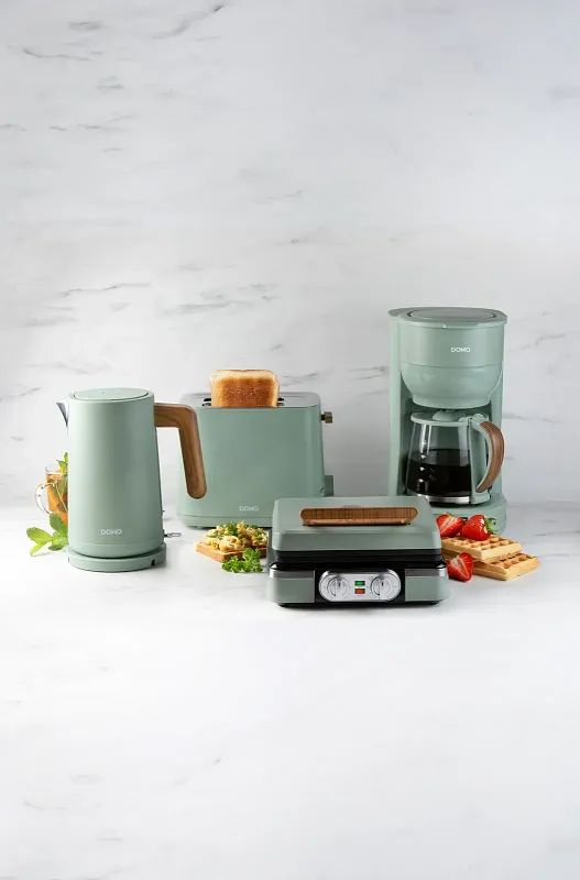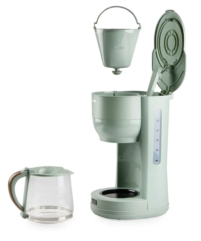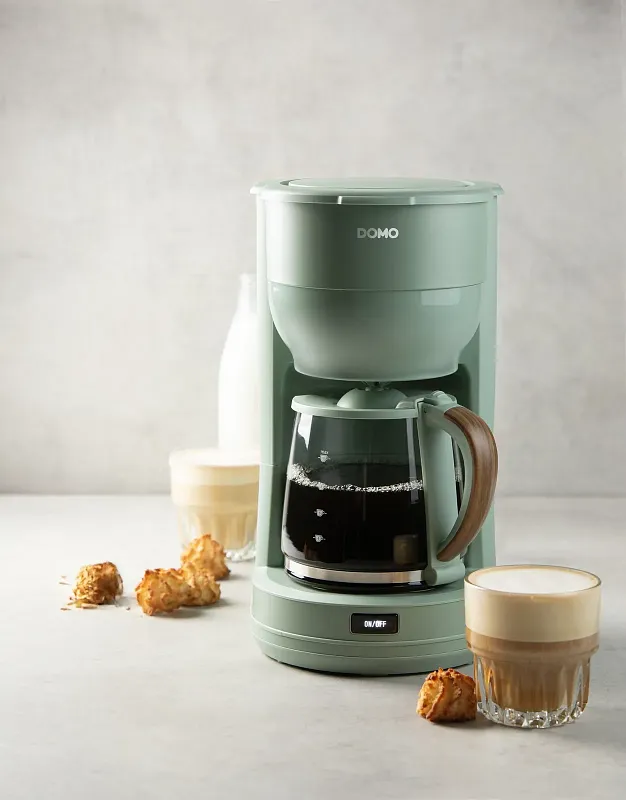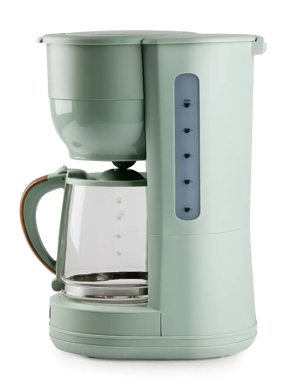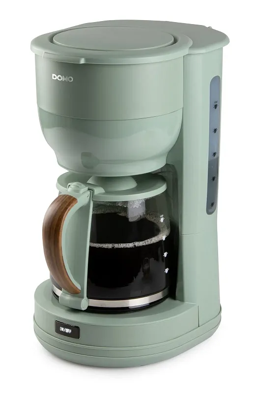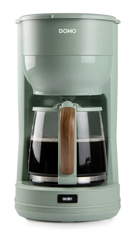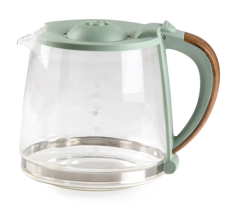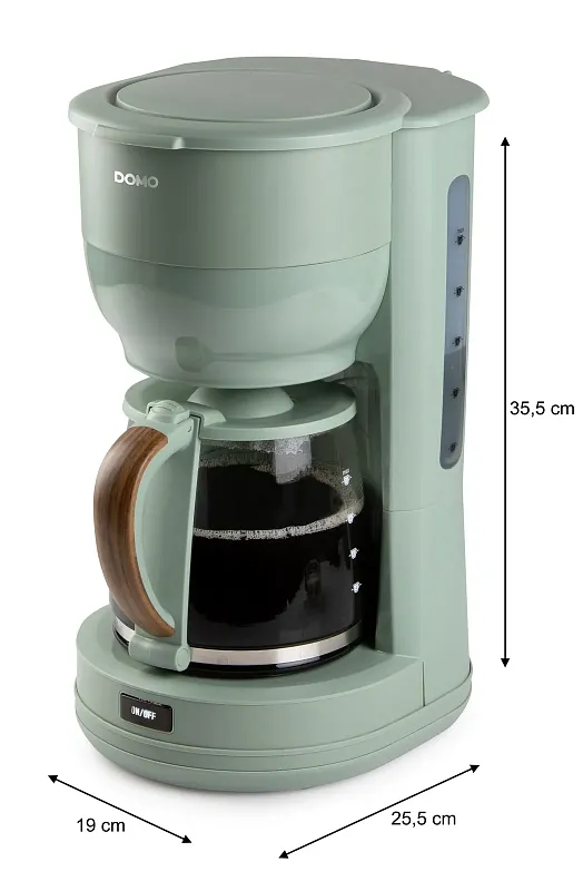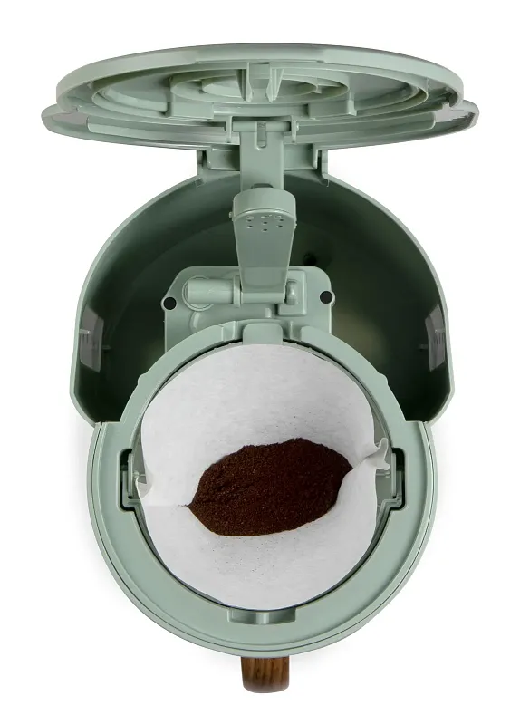 Překapávač na kávu nebo čaj ve stylovém zeleném designu s automatickým vypnutím při nečinnosti. Elegantní design doplňuje skleněná konvice s ukazatelem hladiny a stylovou rukojetí ve vzhledu dřeva.