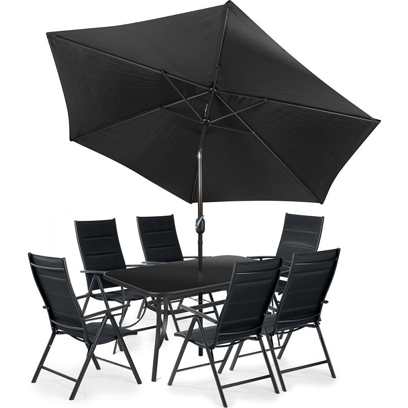 Luxusní set složený ze 6 polohovatelných křesel, stolu se skleněnou deskou a slunečníku Velikost stolu 150 x 71 x 93 cm, výplň černé tvrzené sklo Zádovou opěrku křesla je možné nastavit v 5 polohách Nosnost křesla 120 kg Dvojitá výplň ze syntetické tkaniny umožňuje pohodlný posezení i bez podsedáků Slunečník o průměru 3 m ovládaný kličkou Potah slunečníku 100% polyester 160g / m2 Nevyžaduje žádnou zvláštní údržbu Určeno pro venkovní i vnitřní použití