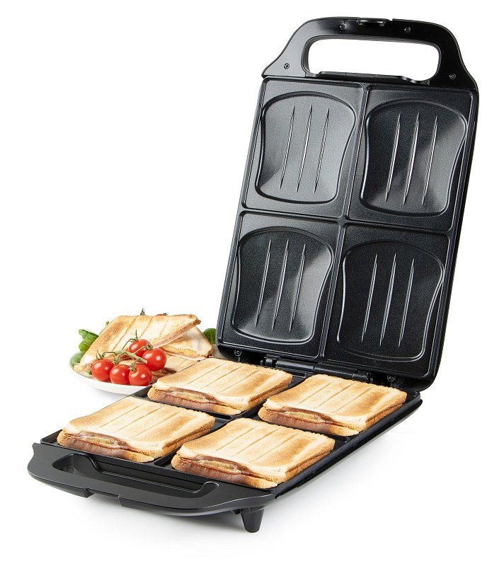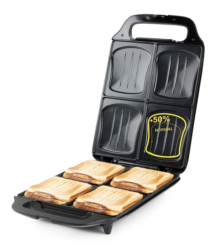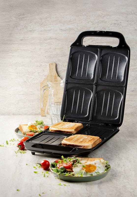 Díky extra velkým plochám o rozměrech 27 x 32 cm připravíte čtyři velké sendviče najednou.