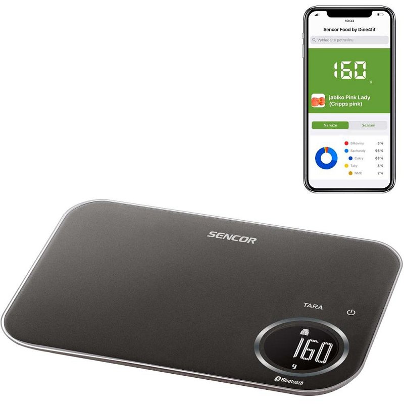 Váha je vybavena bezdrátovou technologií Bluetooth, která ve spojení s bezplatnou aplikací Sencor FOOD nainstalovanou do vašeho chytrého telefonu nabízí přímý přístup k bohaté a pravidelně aktualizované databázi potravin a jejich nutričním hodnotám.