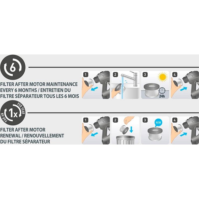 Díky kulatému tvaru tento filtr za motor zaručuje cirkulaci vzduchu bez jakýchkoliv stop prachu